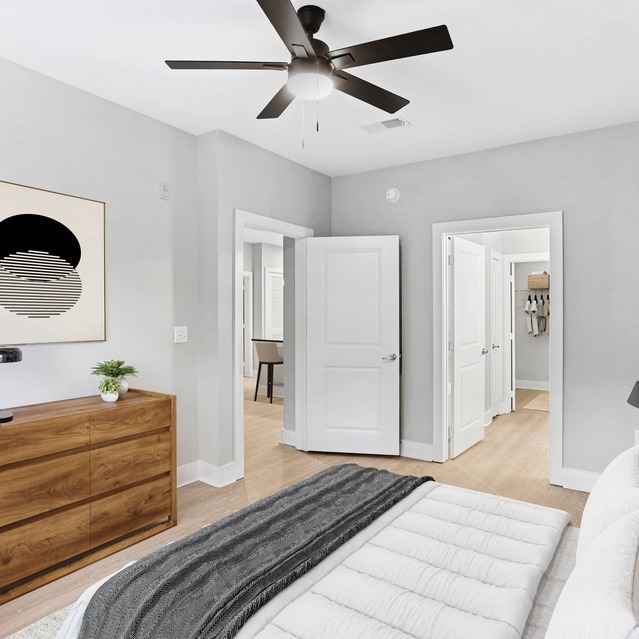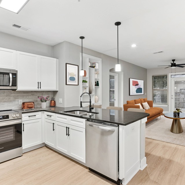 As soon as you enter, you’ll immediately be met with modern finishes like hardwood flooring and soaring 10-foot ceilings. Featuring sleek granite countertops, brick-style backsplash and an Energy Star appliance package, your gourmet kitchen is equally as elegant as it is functional. An in-home washer and dryer set allows you to make quick work of your laundry, while spacious walk-in closets with built-in shelving will keep your clothes in perfect order. In select homes, you can step outside and take in stunning views of our resort-style pool from a private balcony. Our community also offers Spruce cleaning services, so you don’t have to stress about keeping your space tidy.